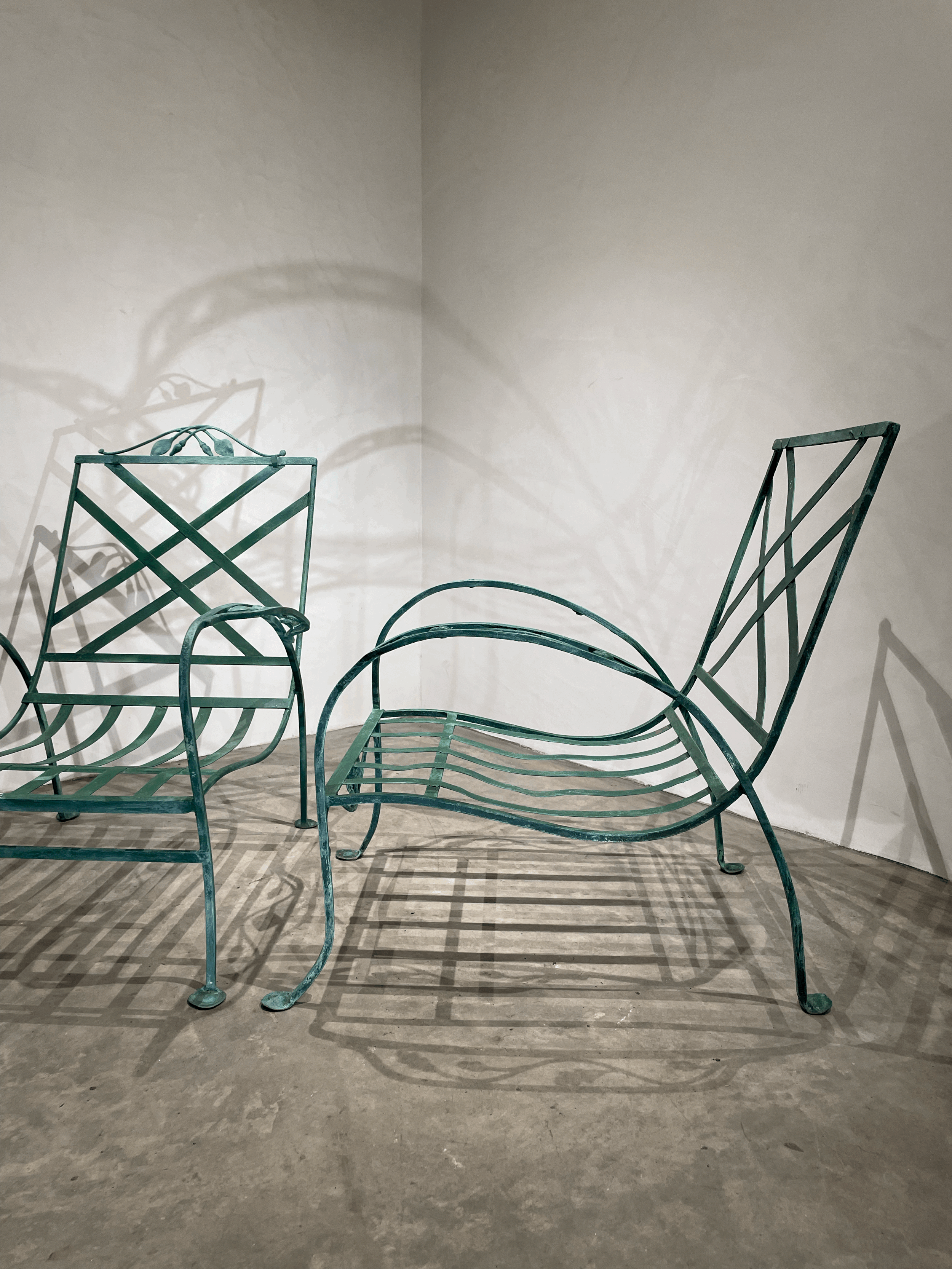 a near pair of mid-century wrought iron Salterini club chairs. A single ottoman also available